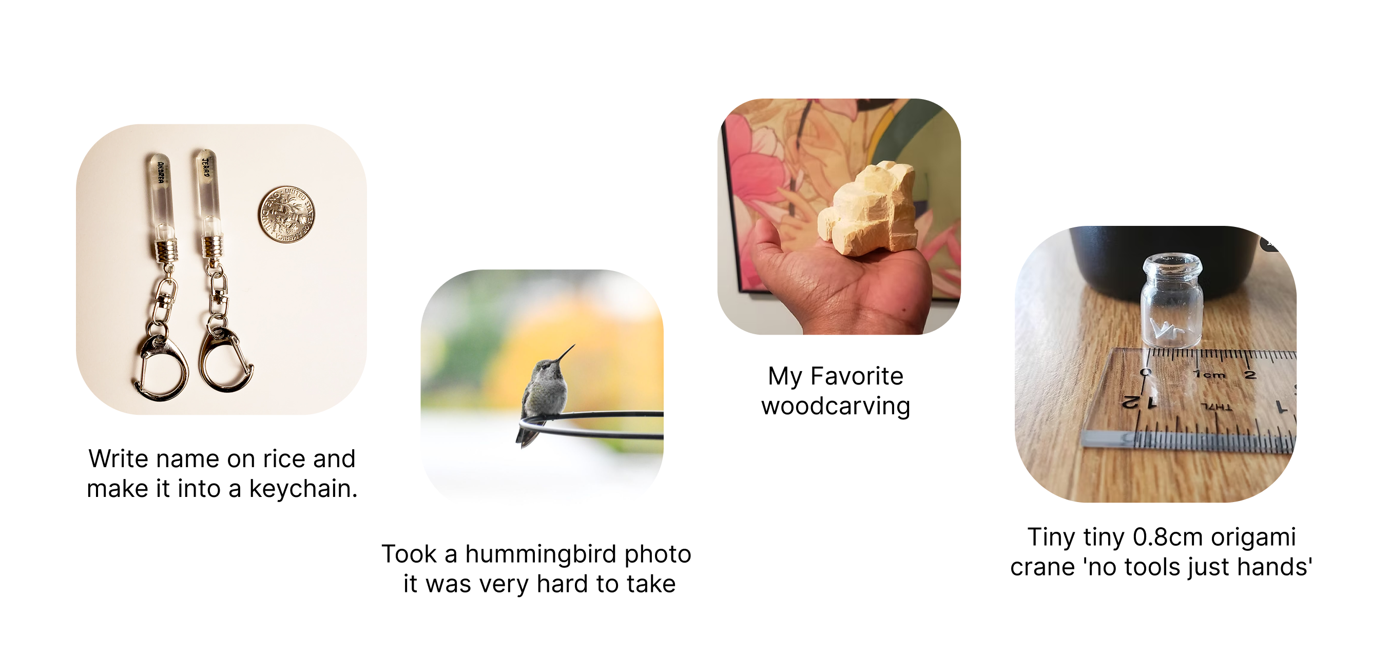 I’m a people person and a passionate photographer who loves capturing small, joyful moments. I enjoy hands-on creativity from wood carving and writing on rice grains to miniature origami.